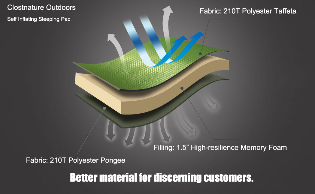 - Clostnature self inflating camping pads for sleeping are designed to be lightweight, packable, low-cost. 210T Polyester Taffeta is wrinkle-resistant and holds well, so there is no need to worry about air cushion deformation.