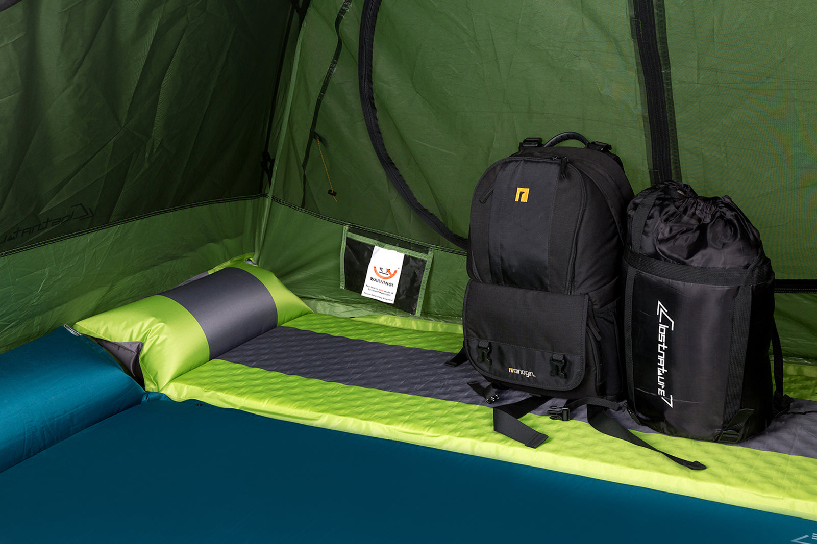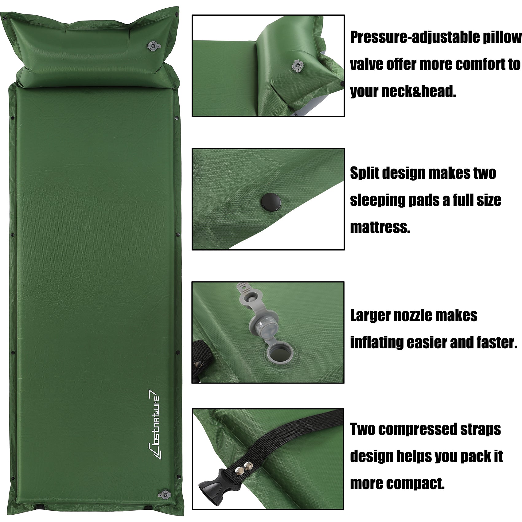 Super easy; No pump needed, twist the quick valve to inflate in minutes; Roll up the camping mat to deflate; The pillow attached to the camp pad can be used separately, the quick button makes pressure adjustable; Reclaim your time from tedious air-blow stuff.