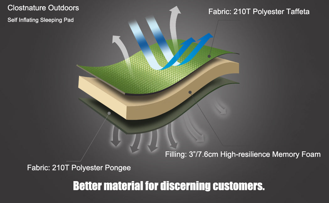 - Clostnature camping mats for sleeping are designed to be lightweight, packable, low-cost. 210T Polyester Taffeta is wrinkle-resistant and holds well, so there is no need to worry about air cushion deformation.