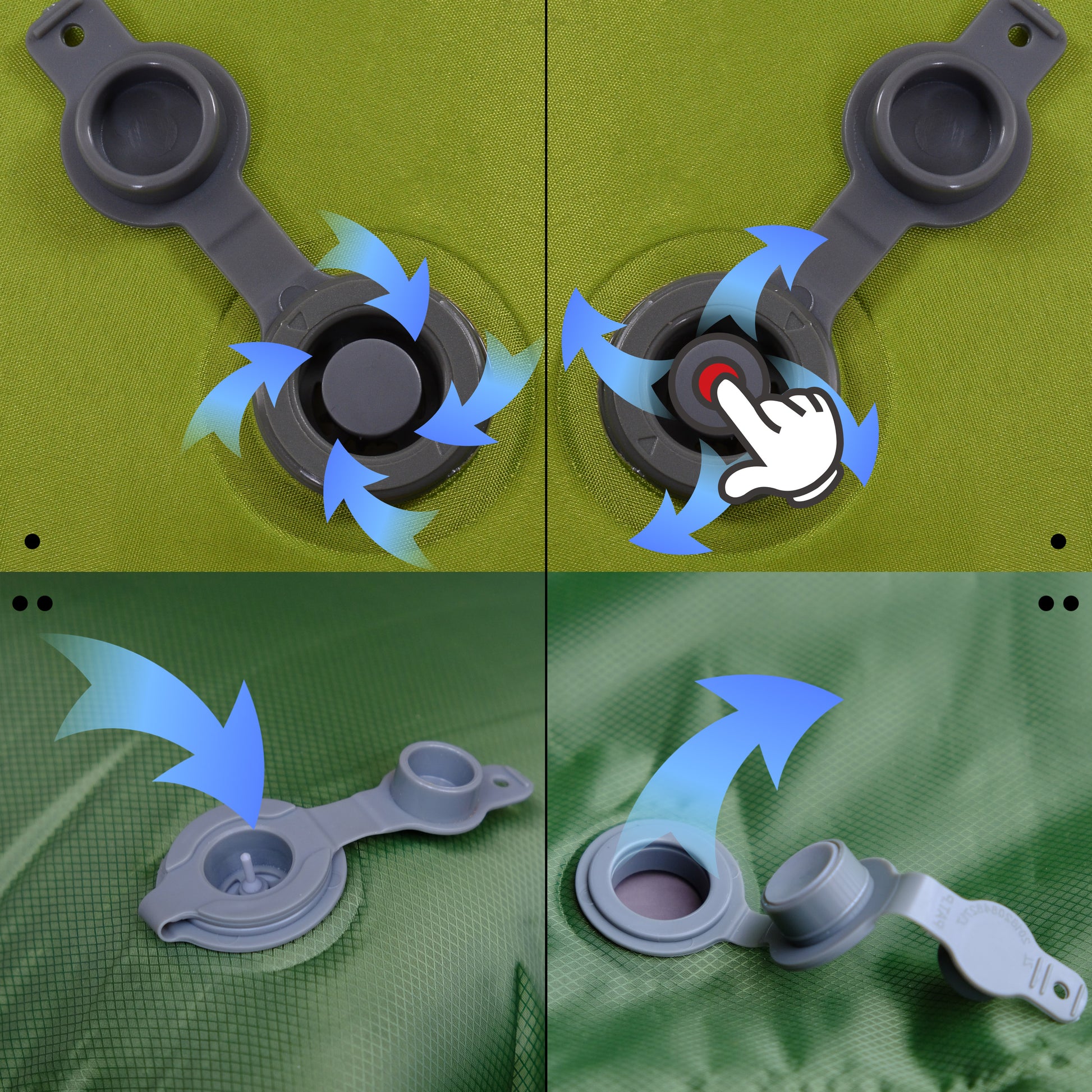 Super easy; No pump needed, twist the quick valve to inflate in minutes; Roll up the camping mat to deflate; The pillow attached to the camp pad can be used separately, the quick button makes pressure adjustable; Reclaim your time from tedious air-blow stuff.