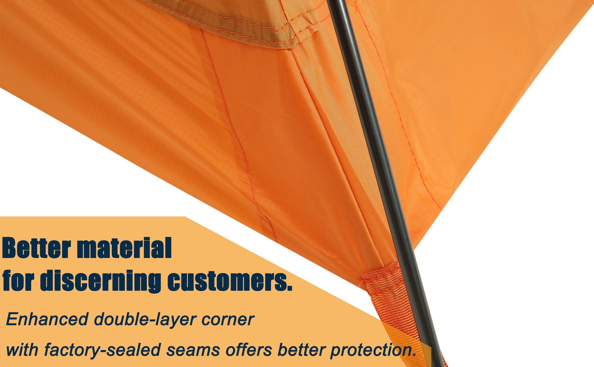 210T Polyester rain fly&groundsheet&bathtub with PU 5000 coating are firmer than you expected. Weatherproof material with factory-sealed seams keep you dry and comfortable in all season&all weather condition! Better material but more affordable!