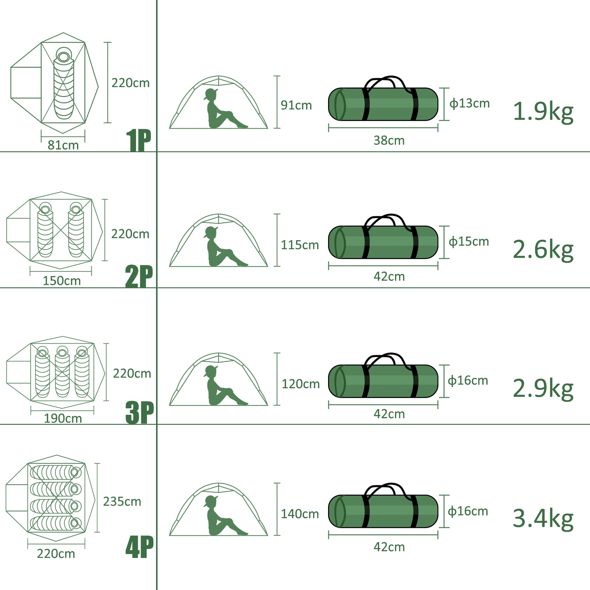 A Lightweight tent with comfortable big interior space creates more enjoyable backcountry trips. This ultralight single person tent only weighs 3.7 lbs. Packed Size: 15''x5''x5'', easy to put in one’s backpack. Interior Size 7'3'' x 2'8''x 3', spacious room for a good sleep.
