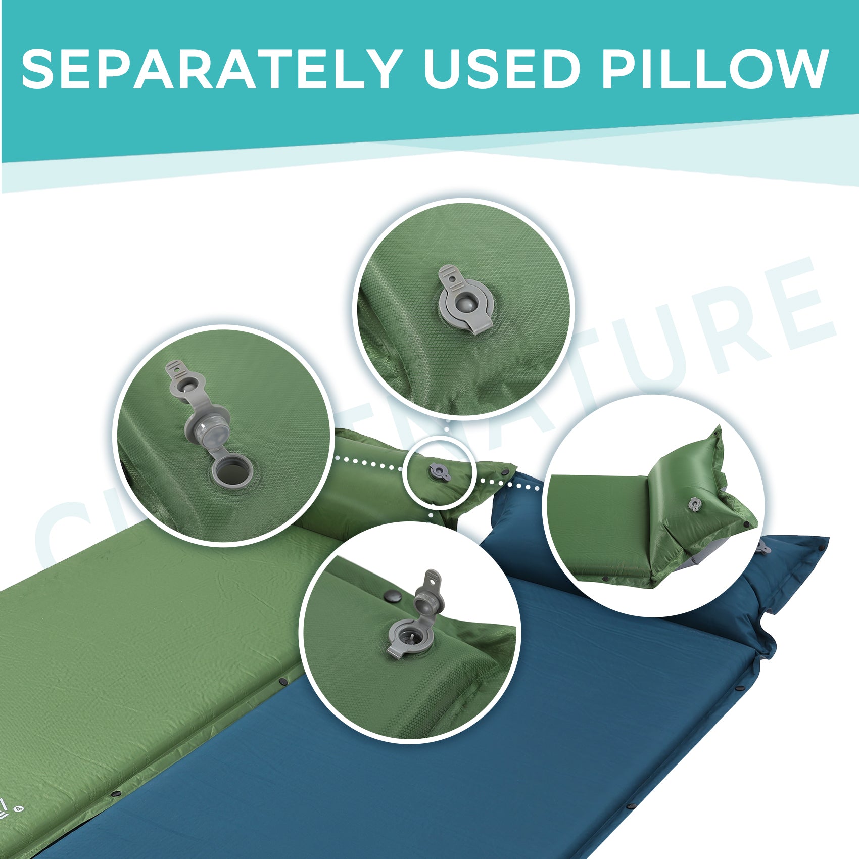 Super easy; No pump needed, twist the quick valve to inflate in minutes; Roll up the camping mat to deflate; The pillow attached to the camp pad can be used separately, the quick button makes pressure adjustable; Reclaim your time from tedious air-blow stuff.